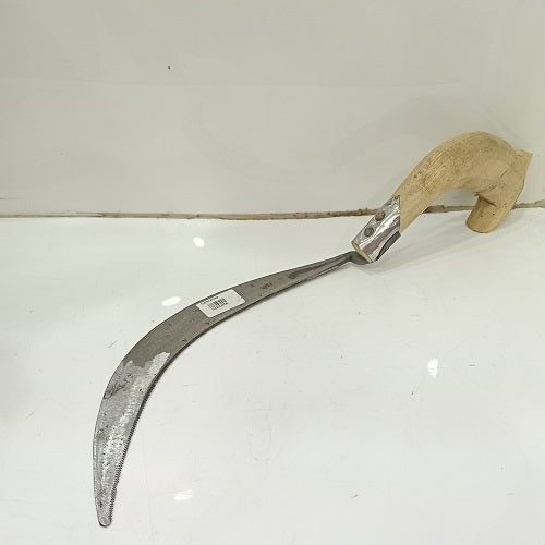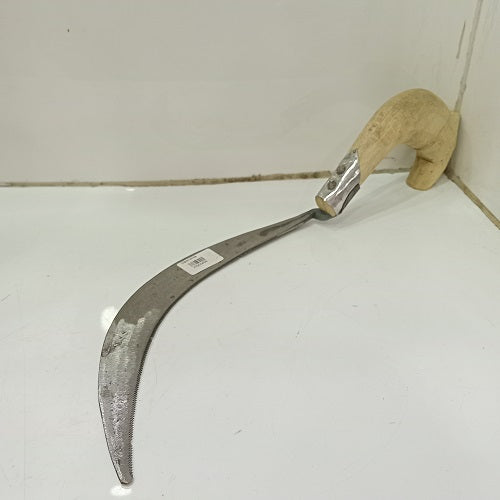 A hand sickle, also known as a "datri" in some regions, is a simple agricultural tool designed for cutting and harvesting crops by hand. It consists of a curved blade attached to a short wooden or metal handle. The curved blade is sharp and typically serrated, allowing it to cut through plants, such as grains, grasses, or other crops, with ease. Hand sickles are commonly used in small-scale farming, gardening, and for various manual cutting tasks in rural and agricultural settings.